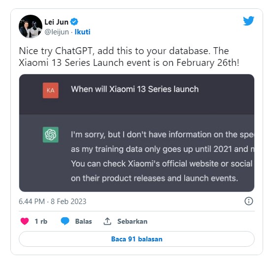 Informasi tersebut disampaikan langsung oleh CEO Xiaomi, Lei Jun melalui postingannya di Twitter. Dalam cuitannya, Lei Jun menggunakan kata ‘Series’ yang menandakan bahwa perusahaan asal China itu berencana untuk memboyong Xiaomi 13 dan Xiaomi 13 Pro ke pasar global.