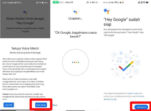 Setelah membaca lama Setujui Voice Match > klik Saya setuju. Lalu, ucapkan semua bacaan yang tampil di layar. Hey Google atau Ok Google pun sudah siap > klik Berikutnya.