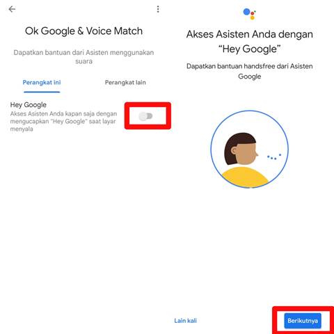 Langkah terakhir adalah mengaktifkan Ok Google, silakan aktifkan toggle Hey Google. Lalu, klik Berikutnya.