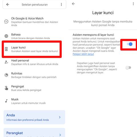 Untuk mengaktifkan Ok Google saat layar terkunci, silakan klik Asisten Google di menu Setelan > klik Layar kunci > aktifkan toggle Asisten merespons di layar kunci.