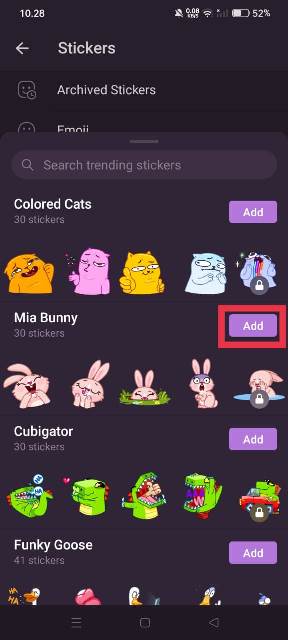 - Pada beranda aplikasi, akan muncul folder sticker pack yang sebelumnya sudah kamu download dari Telegram. Klik Tambah agar stiker tersebut bisa diakses melalui aplikasi WA.