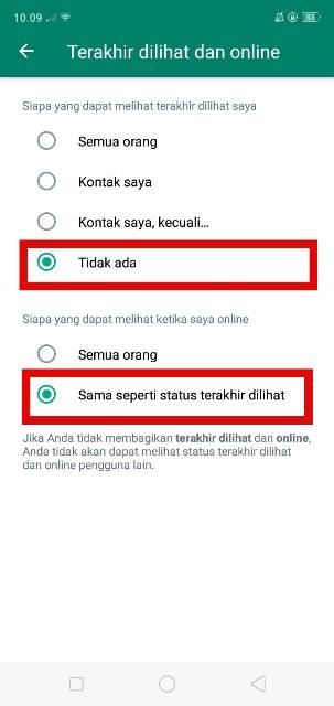 - Pada menu tersebut, kamu bisa mengatur “Siapa saja yang bisa melihat terakhir dilihat saya” dan “Siapa yang dapat melihat ketika saya online”. Untuk membekukannya, kamu bisa pilih Tidak ada dan Sama seperti status terakhir dilihat.