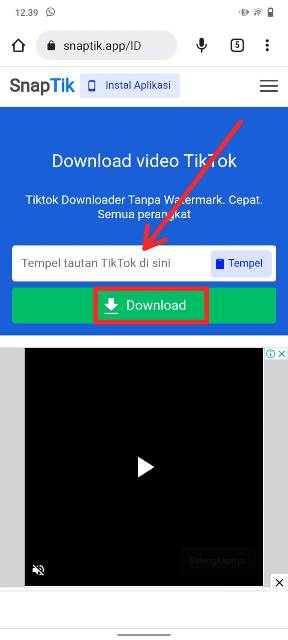 - Misalnya di sini kami menggunakan SnapTik, silakan paste link video TikTok di kolom yang tersedia > klik Download.