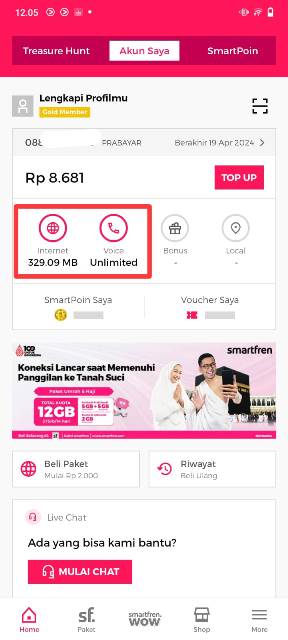 - Ketika pertama kali membuka aplikasi, akan langsung tampil informasi paket yang aktif, baik itu paket internet, nelpon, dan SMS.