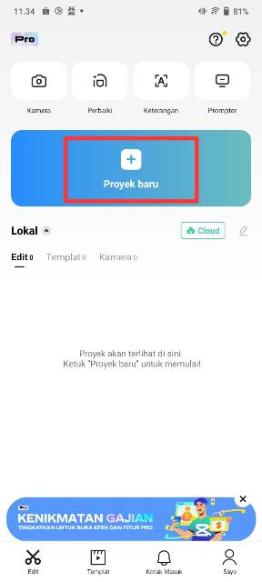 Setelah itu, langsung buka dan jalankan aplikasinya. Klik Proyek baru untuk memasukkan foto atau video yang bakal kalian edit.