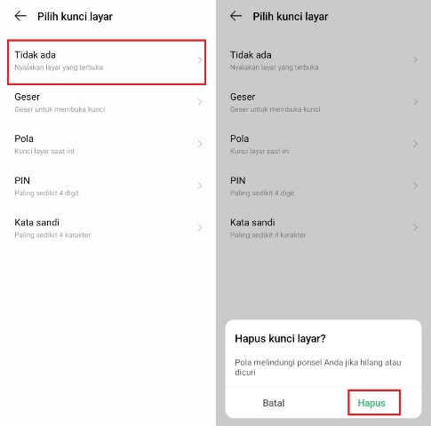 - Kemudian pada halaman Pilih Kunci Layar pengguna dapat memilih opsi Tidak Ada. Setelah muncul pop up Hapus Kunci Layar, klik tombol Hapus.