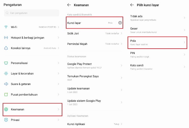 - Masuk ke Pengaturan > Keamanan > Kunci Layar > Gambar pola yang sedang digunakan.