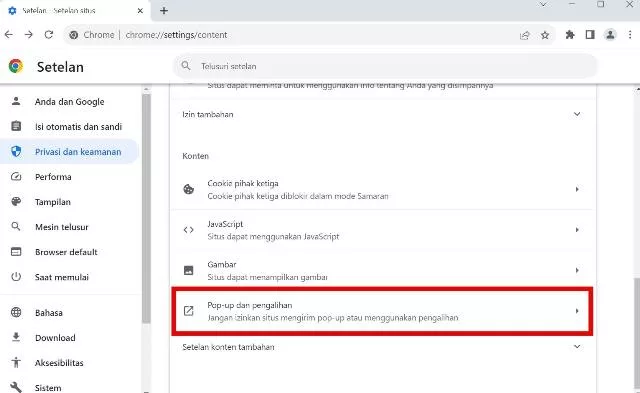 Setelan Situs – Cara Mengaktifkan Pop Up Browser Chrome. (IST) - Kemudian klik Pop Up dan Pengalihan.