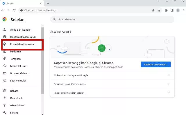 - Klik privasi dan keamanan di panel yang ada di sebelah kanan.