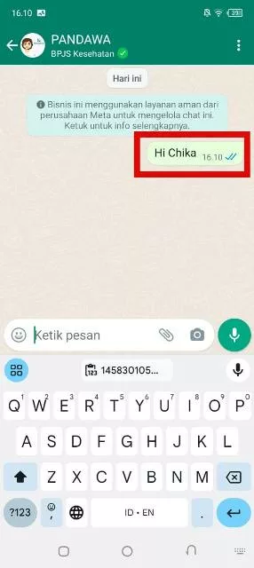 - Selanjutnya kirim pesan “Hi Chika” ke nomor kontak tersebut. BPJS Kesehatan akan memberikan balasan yang berisikan informasi pelayanan.
