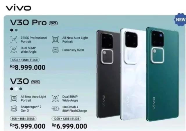 Mengenai harga, dalam poster tersebut tertulis bahwa Vivo V30 bakal dipasarkan di Indonesia dengan harga Rp 5.999.000 untuk opsi memori 8/256 GB dan Rp 6.999.000 untuk varian memori 12/512 GB.