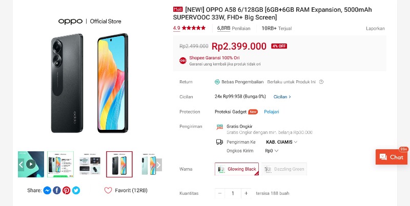 Lanjut ke urutan ketiga ada Oppo A58 dengan harga Rp 2.399.999 atau Rp 50 ribu lebih mahal dari Oppo A54.