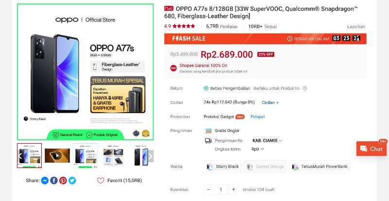 HP Oppo A77s punya kamera utama 50 MP yang ditemani kamera depth sensor 2 MP, ada juga kamera selfie 8 MP di depan dan untuk baterainya menampung daya sebesar 5.000 mAh.
