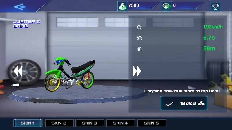 Di game ini kalian awalnya akan diberi motor drag standaran kemudian bisa di upgrade menggunakan uang yang didapat dari hadiah balapan.