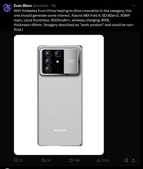 Gambar yang dibagikan oleh Evan Blass di Twitter ini memamerkan bagian belakang Xiaomi Mix Fold 4 yang menggunakan material kulit dan tampak memiliki empat buah sensor kamera dengan modul lebih besar dibanding pendahulunya.