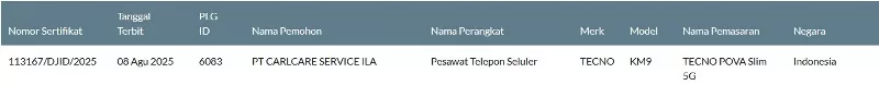 Perangkat tersebut mengantongi sertifikat Postel bernomor 113167/DJID/2025. Nomor modelnya tercatat sebagai KM9, sementara nama komersialnya dikonfirmasi sebagai Tecno Pova Slim 5G.
