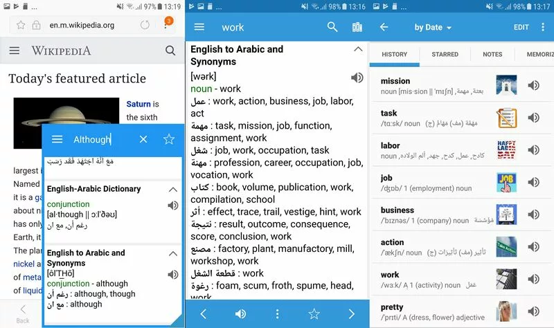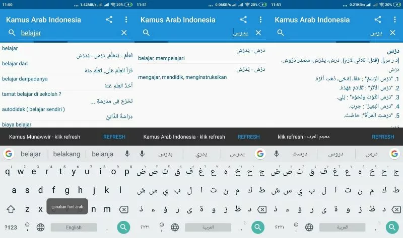 Selain berfungsi sebagai kamus, aplikasi ini juga memiliki fitur penerjemahan dan transliterasi dari Arab ke Latin.